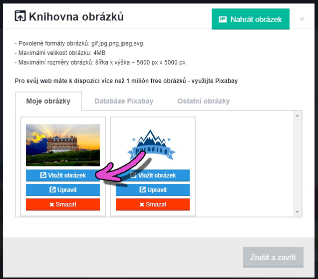 Otevře se knihovna obrázků. Pokud chcete použít obrázek, který máte již nahraný, tak stačí zvolit Vložit obrázek.