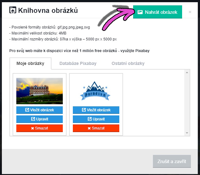 Pokud požadovaný obrázek nemáte ještě nahraný v knihovně, tak zvolíte Nahrát obrázek.